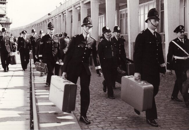 Formaat : 13 x 18 cm. - Een groep politieagenten uit Londen op de Pakketbotenkaai bij hun aankomst te Oostende. Zij waren hier op uitnodiging van hun Oostendse collega's.