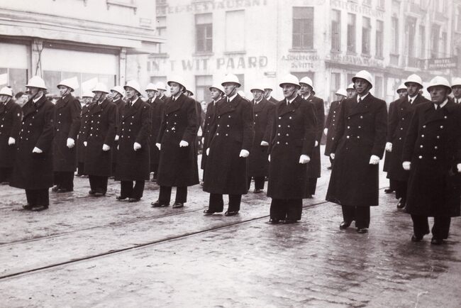 Formaat : 13 x 18 cm. - Defilé van de Oostendse politie op de Alfons Pieterslaan tegen de hoek van de Kanunnik Dr. Louis Colensstraat. Op de achtergrond Hotel-Restaurant In 't Wit Paard uitgebaat door A. Scherpereel…