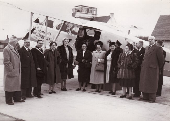 Formaat : 13 x 18 cm. - Een afvaardiging van het gemeentebestuur van de Britse badplaats Southend-on-Sea bracht een 3-daags bezoek aan Oostende. Een tweedekker van East Anglian Flying Services bracht de afvaardiging naar…