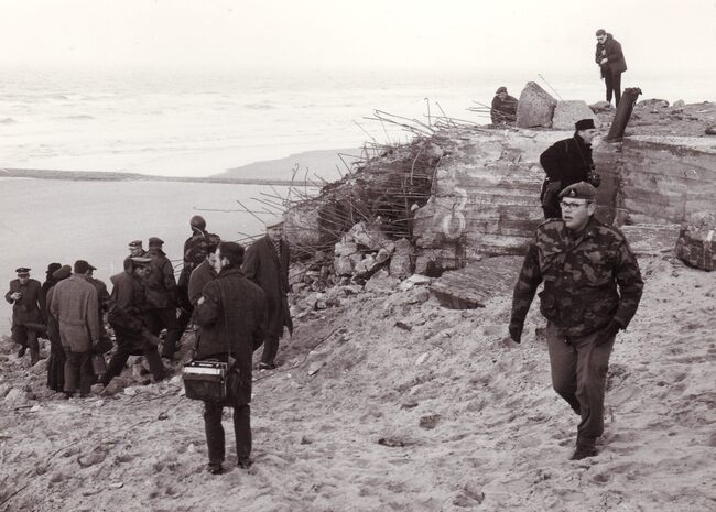 Formaat : 13 x 18 cm. - Afbraak van een bunker uit de Tweede Wereldoorlog in de duinen op de Oosteroever. De genie helpt met het opblazen van de bunker.