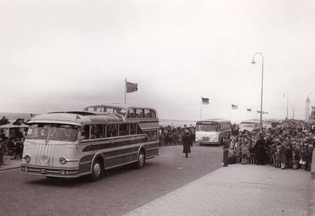 Formaat : 13 x 18 cm. - Britse dubbeldekkers geparkeerd op de gronden van het nog te bouwen Kursaal aan het Monacoplein. De straat op de achtergrond is de Langestraat.