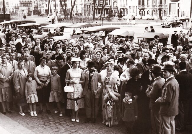 Formaat : 13 x 18 cm. - De deelnemers aan een wedstrijd voor auto's wachten op de Albert I-Promenade aan het Kursaal (toen nog niet herbouwd).