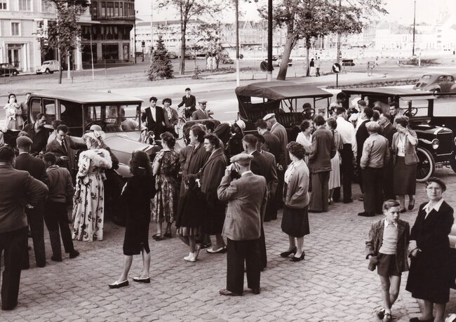 Formaat 13 x18 cm. - Belangstellenden bij een verzameling Oldtimers tijdens een treffen op het Canadaplein. Op de achtergrond Hendrik Serruyslaan