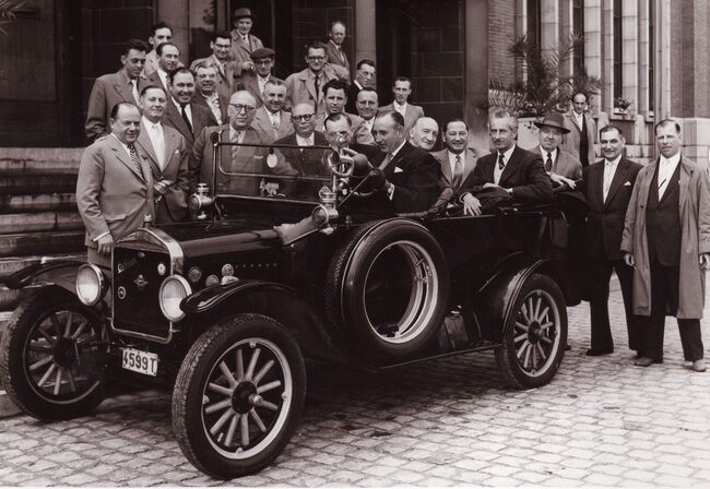 Formaat : 13 x 18 cm. - De inrichters en deelmemende garagehouders aan een tentoonstelling van auto's op het terrein van de Sint Sebastiaansgilde aan de Leffingestraat. Ingericht door de Verenigde Merkagenten van 25…