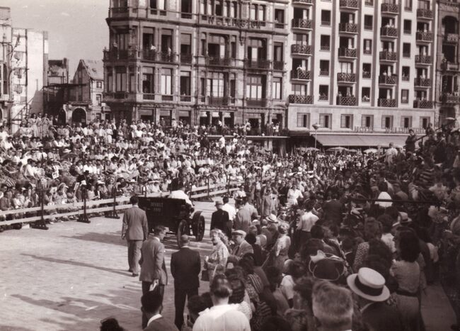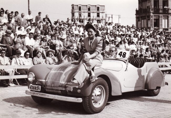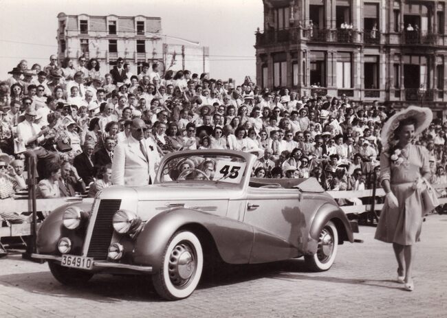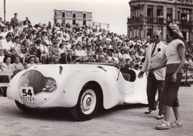 Formaat : 13 x 18 cm. - Wedstrijd voor auto's op de Albert I-Promenade. Een deelnemer passeert de jury aan de site van het nog niet herbouwde Kursaal.