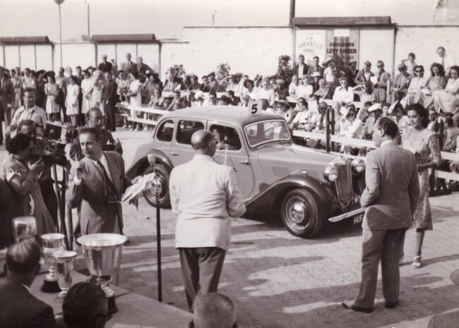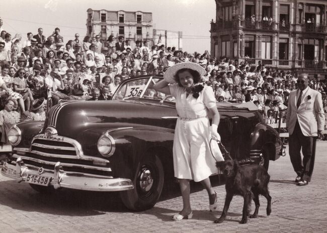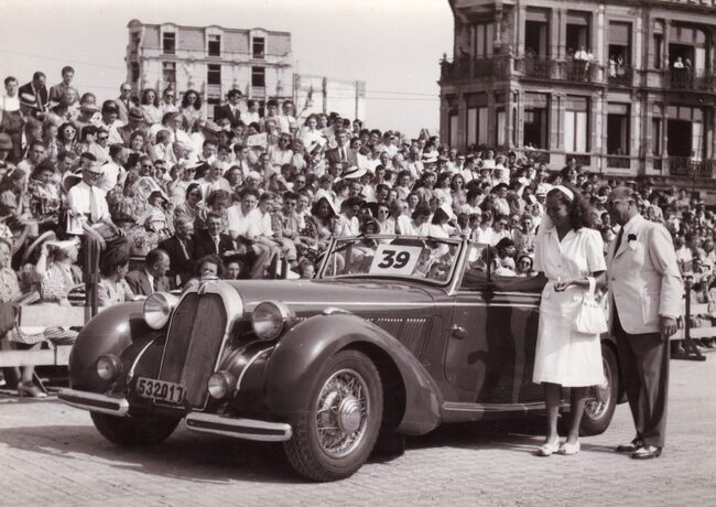 Formaat : 13 x 18 cm. - Wedstijd voor auto's op de Albert I-Promenade aan het nog niet herbouwde Kursaal. Burgemeester Hendrik Serruys feliciteert een winnaar.