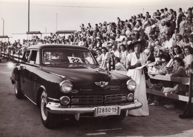 Formaat : 13 x 18 cm. - Wedstrijd voor auto's op de Albert I-Promenade. Een Studebaker passeert de jury aan Petit Nice.