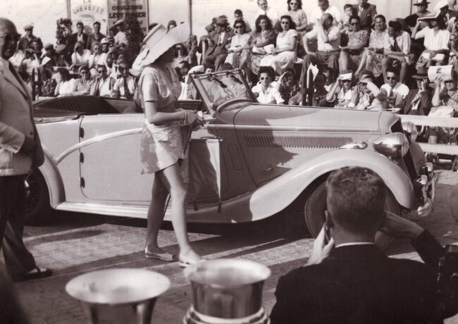 Formaat : 13 x 18 cm. - Een deelnemer aan een wedstrijd voor auto's op de Albert I-Promenade nabij Petit Nice. Een deelnemende Pontiac Convertible Coupe.