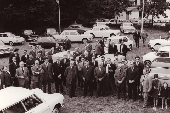 Formaat : 13 x 18 cm. - De inrichters van een autotentoonstelling op het terrein van de Sint-Sebastiaansgilde aan de Leffingestraat. Ingericht door de Verenigde Merkagenten van 25 tot 27 september 1965