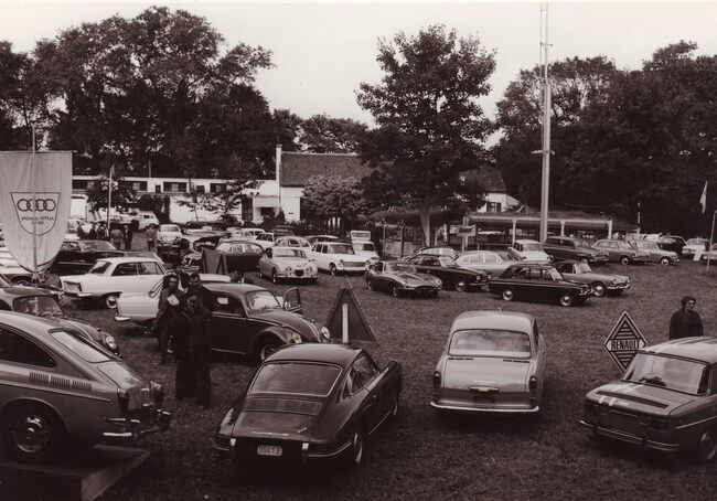 Formaat : 13 x 18 cm. - Een tentoonstelling van auto's op het terrein van de Sint-Sebastiaansgilde aan de Leffingestraat, ingericht door de Verenigde Merkagenten. De tentoonstelling was van 25 tot 27 september 1965…