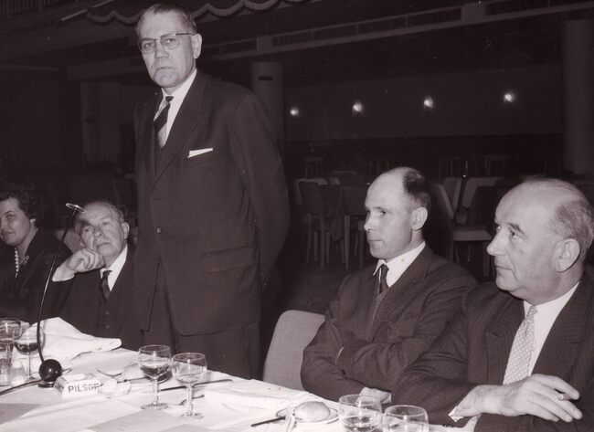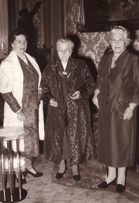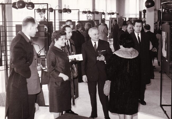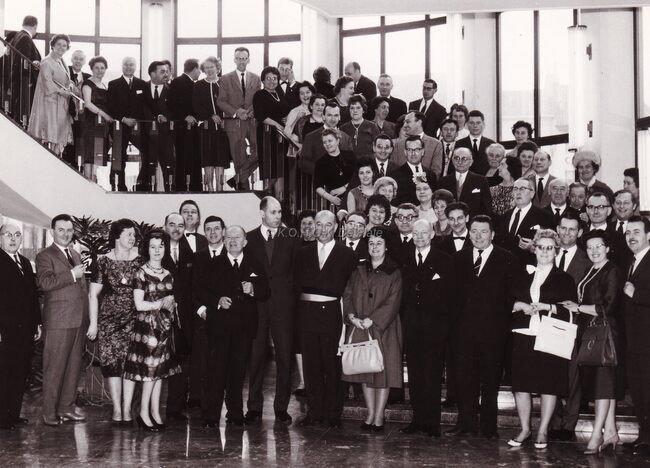 Formaat : 13 x 18 cm. Een groep bewoners van Godtschalck met hun directrice op de wereldtentoonstelling 1958 voor het paviljoen van de Sovjet-Unie.