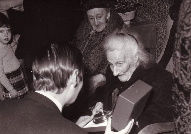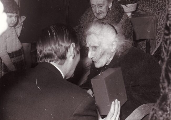 Formaat : 13 x 18 cm. - Een 100-jarige vrouw krijgt een geschenk van burgemeester Jan Piers.
