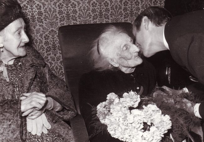 Formaat : 13 x 18 cm. - Burgemeester Jan Piers zet een 100-jarige vrouw in de bloemetjes