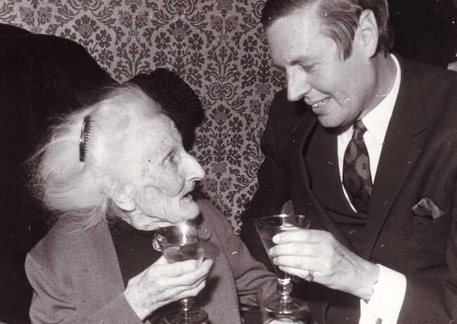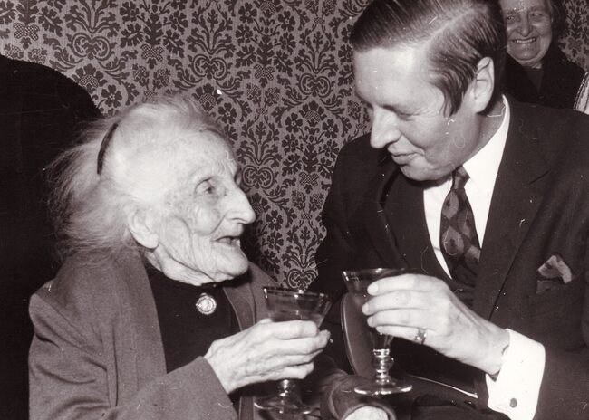 Formaat : 13 x 18 cm. - Burgemeester Jan Piers drinkt samen met een 100-jarige vrouw op haar gezondheid.