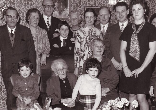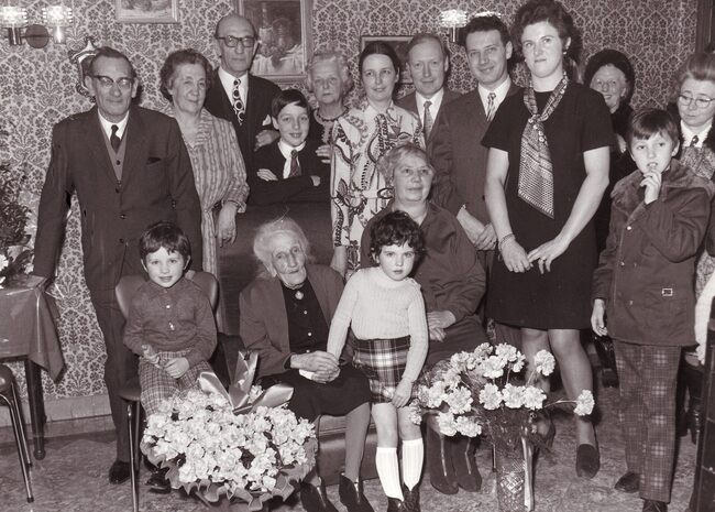 Formaat : 13 x 18 cm. - Een 100-jarige vrouw tussen haar nakomelingen.
