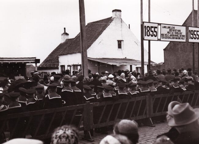 Formaat : 13 x 18 cm. - Viering van Meetje Versluys uit Bredene aan haar geboortehuis. De jongens van de Ibis zijn ook van de partij !
