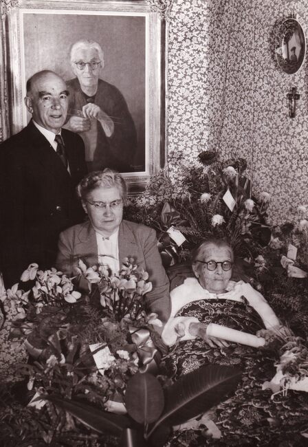 Formaat : 18 x 13 cm. - De 100-jarige Mathilde Demet met kleindochter (?) en haar bruidegom.