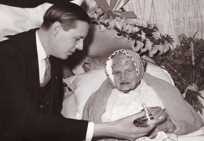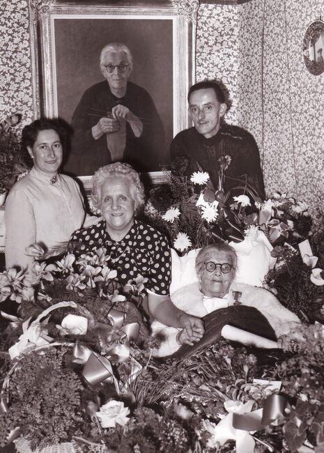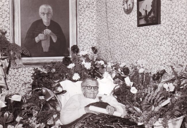 Formaat : 13 x18 cm. - De 100-jarige Versluys uit Bredene op haar bed tussen de bloemen.