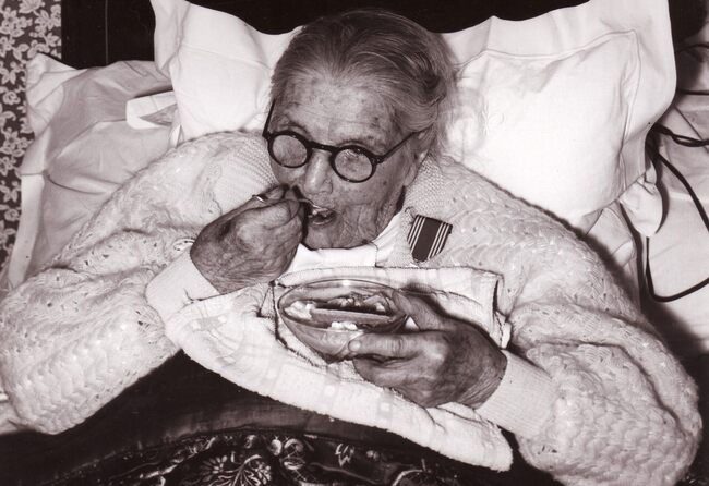 Formaat : 13 x 18 cm. - Meetje Versluys, 100 jaar oud, geniet van een toetje!