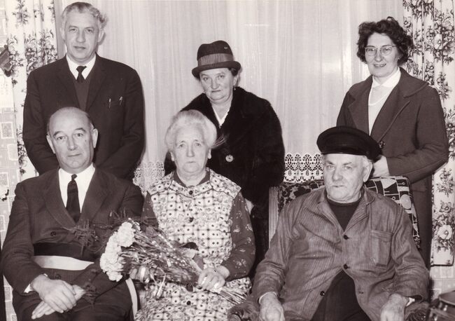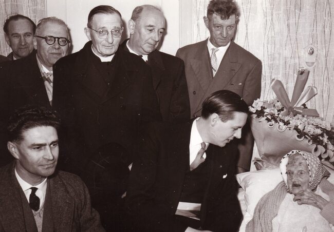 Formaat : 13 x 18 cm. - De 100-jarige Eugenie Vermeersch (Meetje Lingier) krijgt bezoek van burgemeester Jan Piers en burgemeester Albert Claeys van Bredene. Achter burgemeester Piers zien we schepen Kamiel Dehouck.