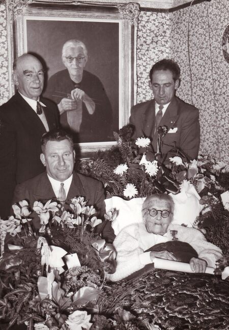 Formaat : 18 x 13 cm. - De 100-jarige Meetje Versluys uit Bredene tussen de bloemen. Naast haar zit haar dochter en familieleden.
