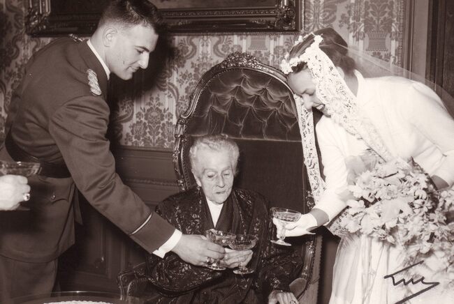 Formaat : 10 x 15 cm. - De 100-jarige Mathilde Desmet heft het glas met kleindochter (?) en haar bruidegom.
