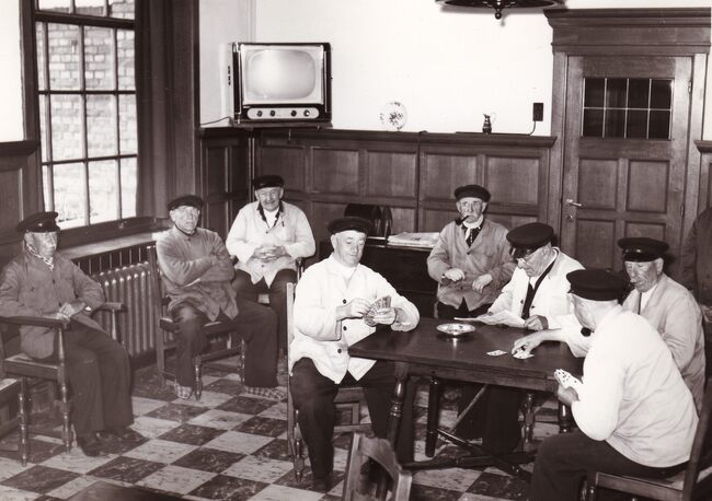 Formaat 13 x 18 cm. - Enkele oude vissers in de ontspanningsruimte van het Godtschalck Instituut aan de Dokter Eduard Moreauxlaan.