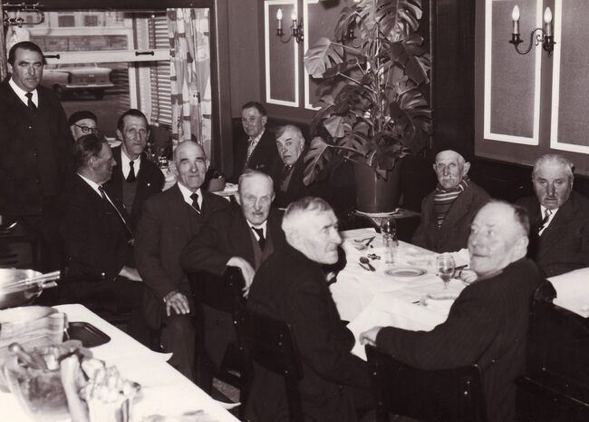 Formaat : 13 x 18 cm. - Een groep bejaarden van het Zeemanshuis Godtschalck op een etentje in restaurant Lusitania aan de Visserskaai. Rechts de uitbater Camiel Vanmassenhove die hen uitnodigde.