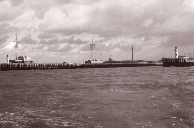 Formaat : 13 x 18 cm. - We zien de haveningang met de twee staketsels en de insteek naar het Montgomerydok (links). Vooraan het gebouw van de jachtclub NSYC en er achter (links) het klein strand.