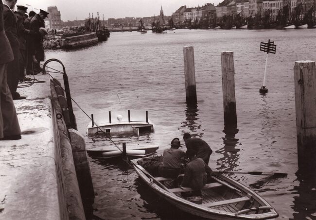 Formaat : 13 x 18 cm. - Een gezonken jacht in het Montgomerydok. De kaaimuur links vertoont nog de sporen van de vernielingen uit de Tweede Wereldoorlog.