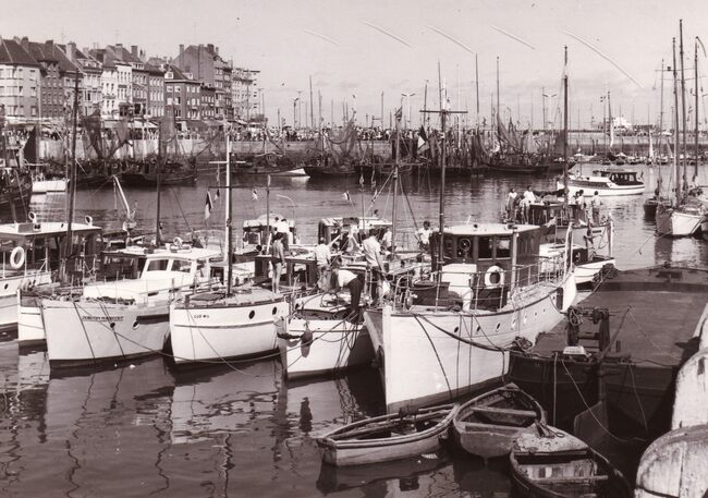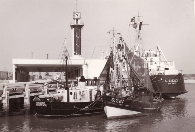 Formaat : 13 x 18 cm. - Het inschepingsgebouw voor de carferry's. De Franse carferry Lisieux uit Dieppe ligt aan de kaai. Op de voorgrond twee Oostendse vissersboten. Oorspronkelijk Controlegebouw der Carferry,…