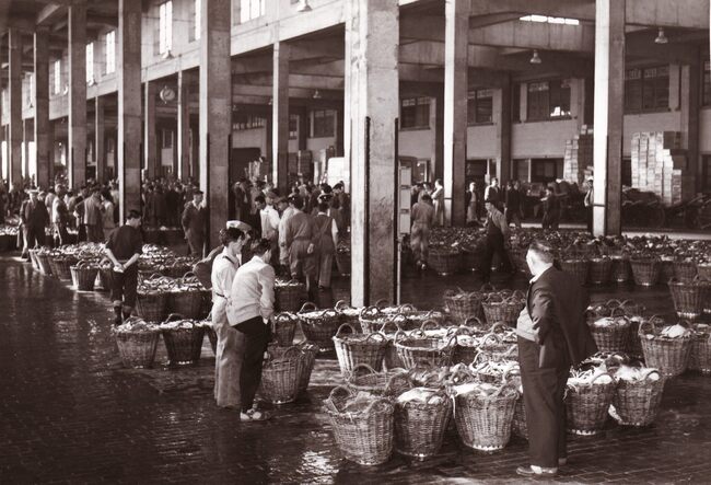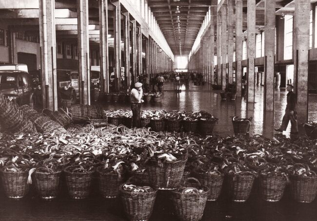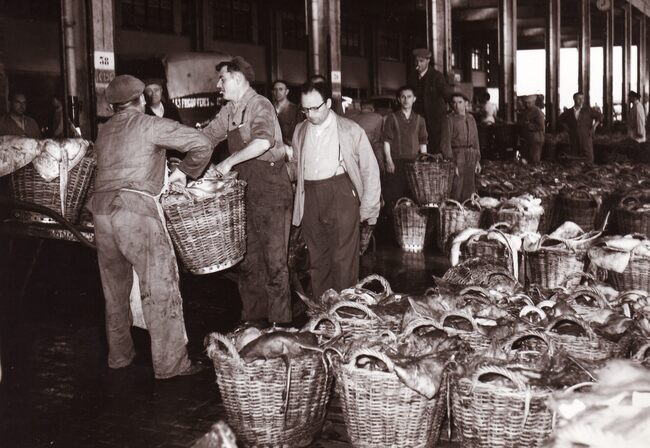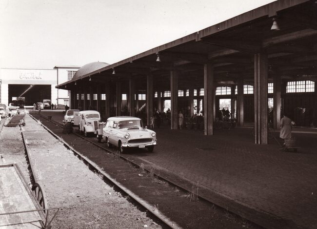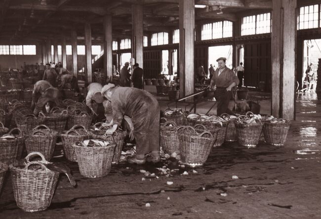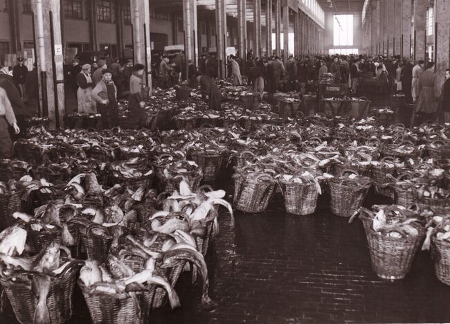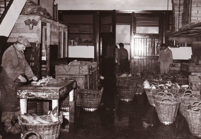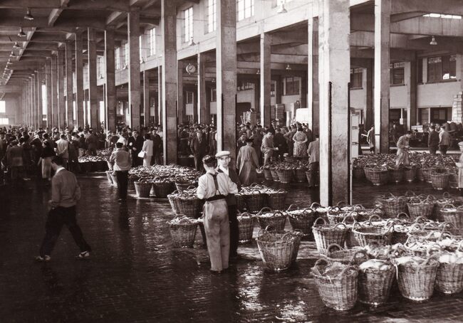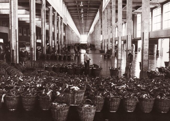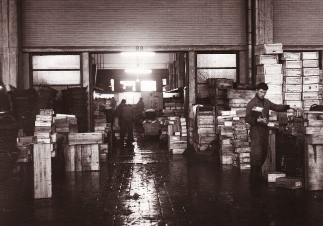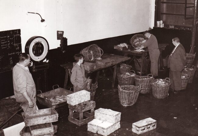 Formaat : 13 x 18 cm. - In de Vismijn worden kistjes vis ingeladen in een wagon van de vistrein voor transport naar het binnenland.