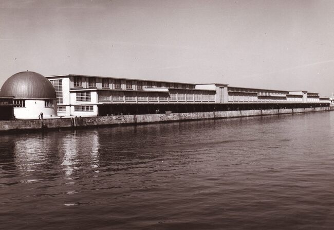 Formaat : 13 x 18 cm. - Zicht op het Visserijdok. Het ronde gebouw is het haringmijn (of sprotmijn) en de Vismijn aan de Vismijnlaan. De bezetter, alvorens Oostende in september 1944 te verlaten, had de…