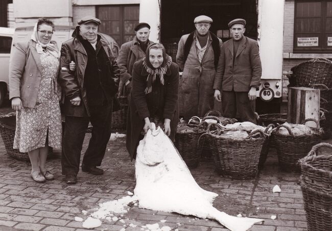 Formaat : 13 x 18 cm. - Inladen van vis op een wagon van de vistrein voor transport naar het binnenland.