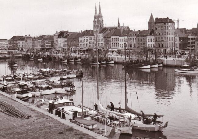 Formaat : 13 x 18 cm. - De pas gebouwde Garnaalmijn aan de Visserskaai. De O.145 Roland ligt in het Montgomerydok
