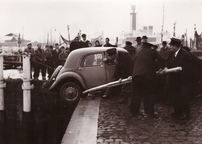 Formaat : 13 x 18 cm. - Een wagen belandde bijna in het Montgomerydok en wordt met vereende krachten op het droge gehouden.