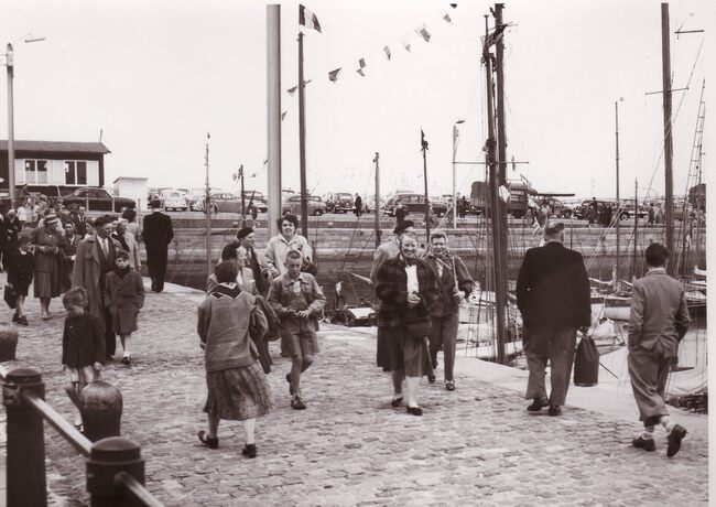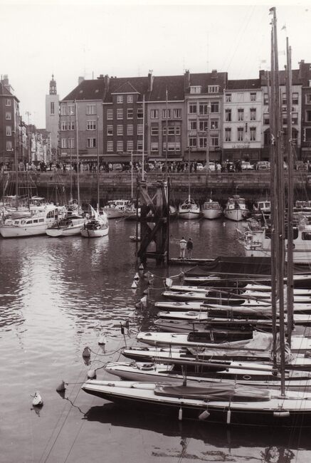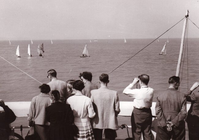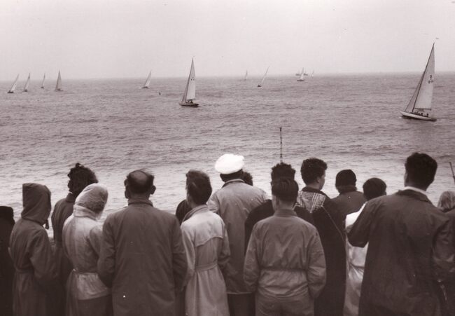 Formaat : 13 x 18 cm. - Toeschouwers bij een zeilwedstrijd met start in de havengeul kijken toe vanop het terras van het clubgebouw van de R.N.S.Y.C.