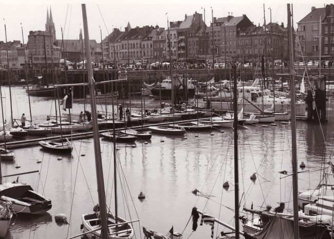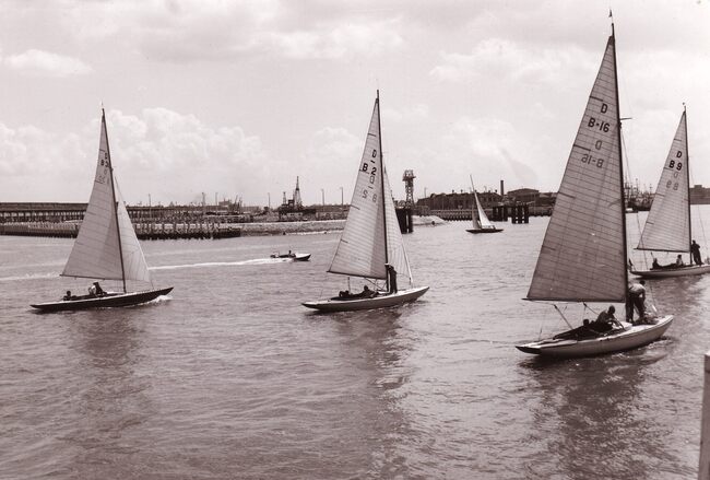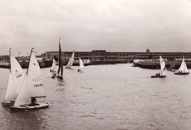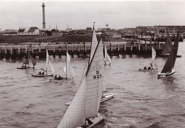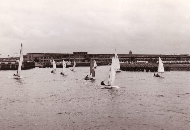 Formaat : 13 x 18 cm. - Deelnemers aan een zeilwedstrijd in de havengeul. Op de achtergrond de vismijn.