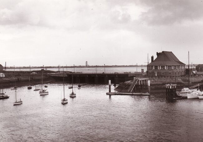 Formaat : 13 x 18 cm. - Zicht vanuit het gebouw van het Loodswezen op het Montgomeydok richting stad.