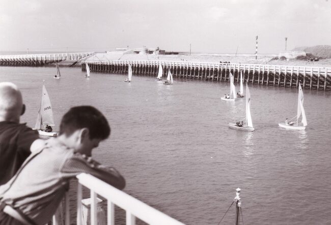 Formaat : 13 x 18 cm. - Deelnemers aan een zeilwedstrijd lopen terug de haven binnen. De Franlis I ligt aan het Weststaketsel. Op de voorgrond drie bootjesroeiers, meestal gewezen vissers, die de mensen overzetten naar de…
