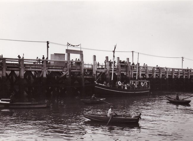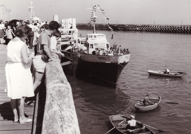 Formaat : 13 x 18 cm. - De Franlis II waarmee zeetochtjes werden gemaakt ligt vertrekkensklaar aan het Weststaketsel. Op de voorgrond een drietal jollen met gewezen vissers, die nog een cent bijverdienden door mensen naar…
