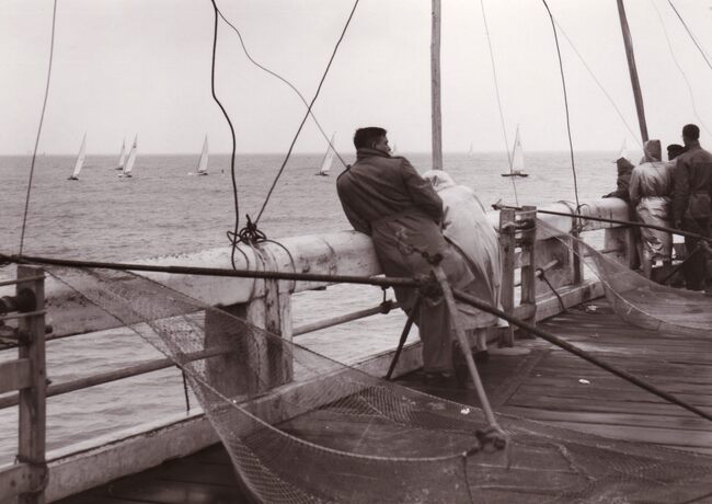 Formaat : 13 x 18 cm. - Deelnemers aan een zeilwedstrijd. In de achtergrond de vismijn