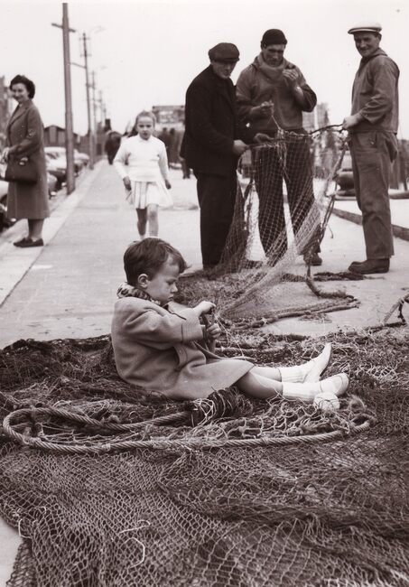 Formaat : 18 x 13 cm. - Vissers herstellen hun korren (netten) langs de Visserskaai. Zelfs het jongste lid van de familie wordt ingeschakeld ! Het jongetje op de voorgrond is Jean Pierre Wynsberghe. Het meisje is …