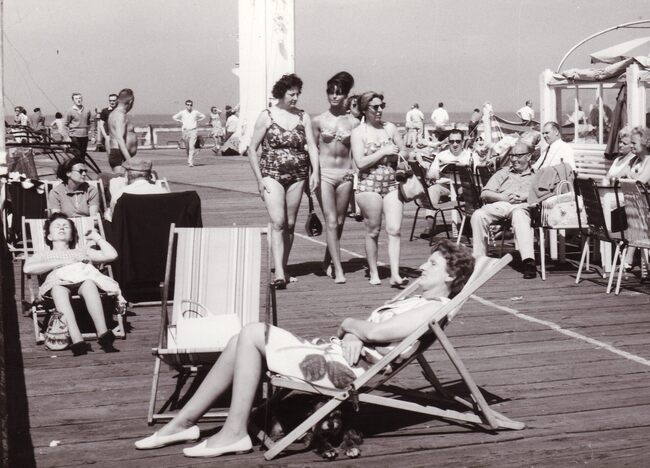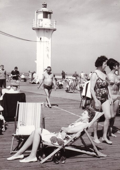 Formaat : 13 x 18 cm. - Genieten van de zon én het zicht aan de zijgevel van de garnaalmijn langs de Visserskaai. De garnaalmijn gebouwd in 1957-1958 door architect en stadsingenieur A. De Vos. Een betonconstructie van…