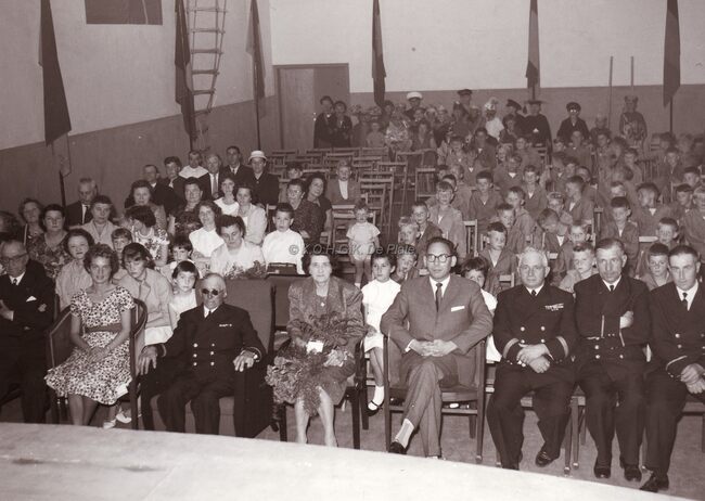 Zicht op de turn (=feest) zaal van de Ibisschool tijdens een schoolfeest.Eerste rij vierde van rechts directeur Hubert CAESTECKER.