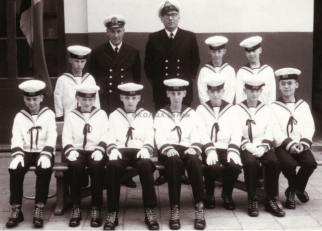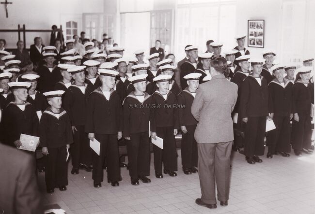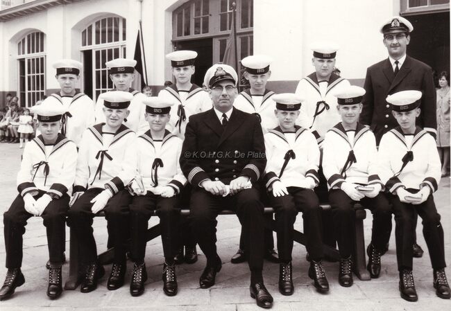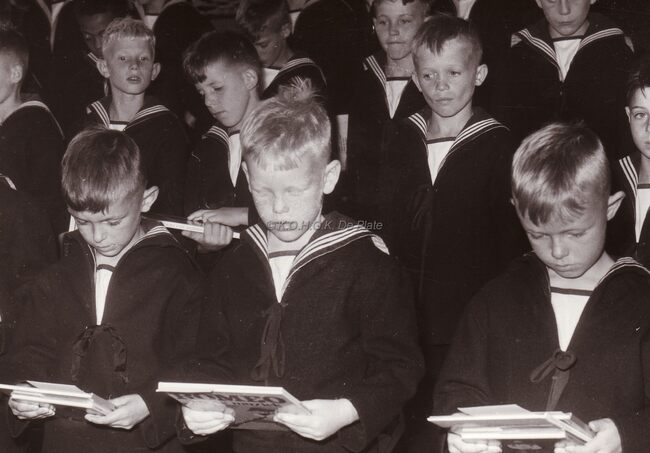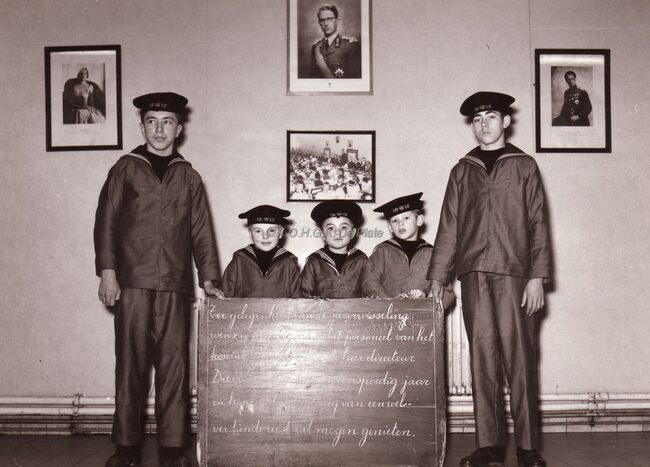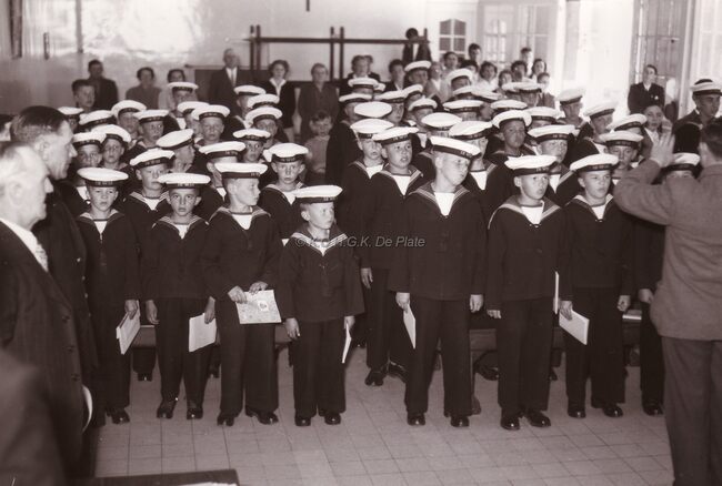 De leerlingen van het Koninklijk Werk Ibis opgesteld rond het Nationaal Monument voor de Zeelieden op het Zeeheldenplein. Vooraan centraal directeur René David. In het begin sierden enkele ontladen zeemijnen het monument…