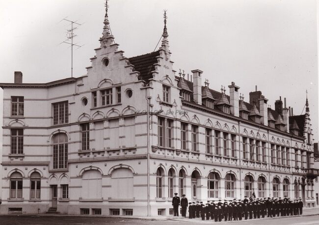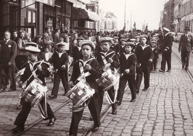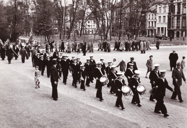 De Ibisjongens en hun kliek komen voorbij de hoek Kapellestraat en marcheren in de Jozef II straat tijdens een vaderlandse plechtigheid.Foto richting Visserskaai. "Dankzij de steun van majoor Gustaaf Fossaert, en het…