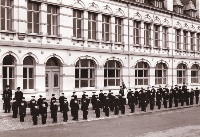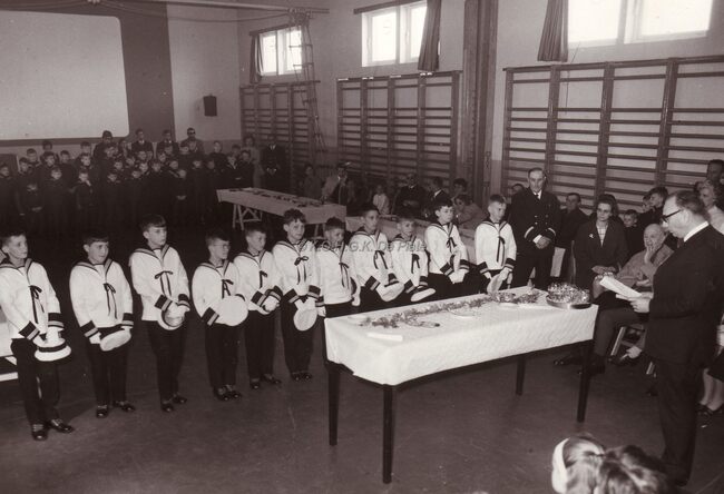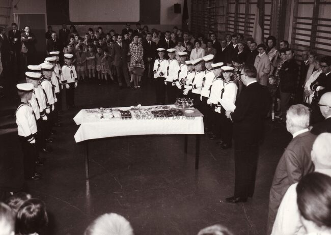 De leerlingen van de Ibisschool opgesteld,compleet mét vaandel,voor de school en klaar om naar een of andere plechtigheid te marcheren.