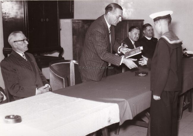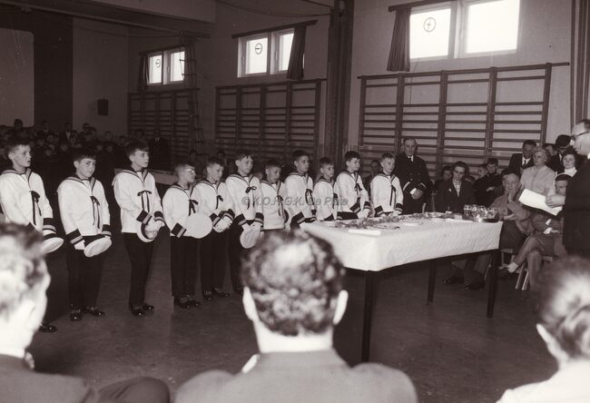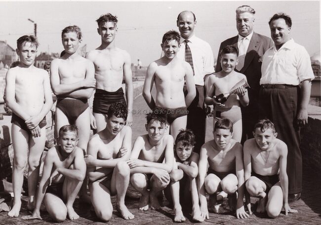 De zwemmende leerlingen van de Ibisschool hebben een beker gewonnen bij wedstrijden aan de "Sports Nautique".Staande achteraan burgemeester August PLOVIE en directeur René DAVID. Hij was directeur in de periode…