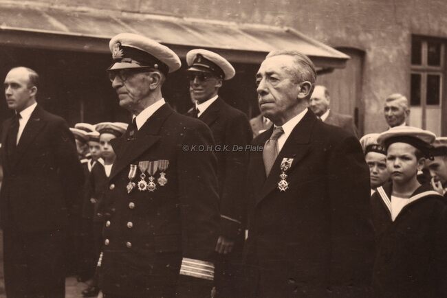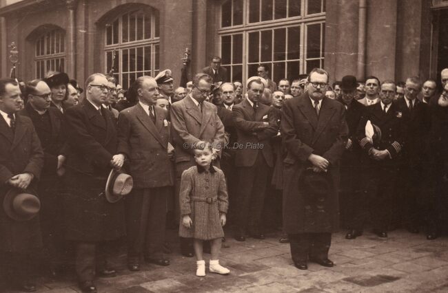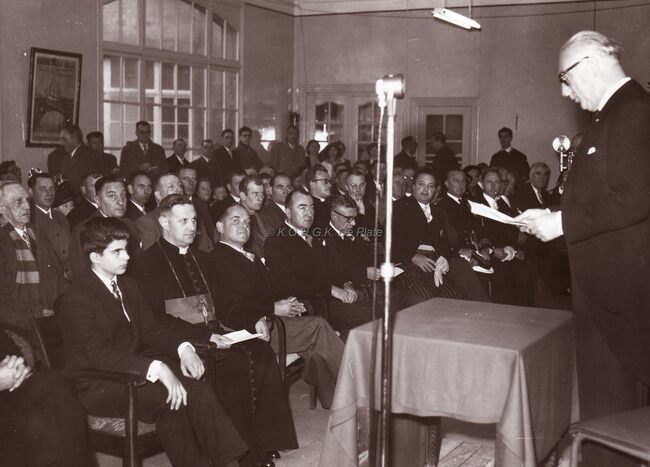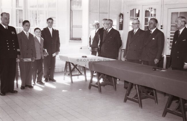 Ontvangst van prins Alexander op de Ibisschool.Naast de prins,bisschop Emiel Jozef DESMEDT dan Adolf VAN GLABBEKE,burgemeester Oostende.Rechts naast de micro August PLOVIE,burgemeester Bredene. "Op dinsdag 30 oktober…